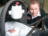 Car seat correctly installed in rainstorm , dad soaked